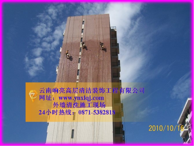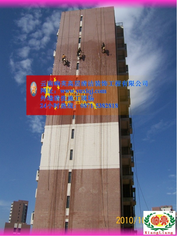 云南響亮清潔有限公司針對不同樓宇采用不同的清潔方法,本著以安全第一,質量為主,客戶至上的原則,采用高空吊籃或高空吊板的形式進行外墻高空作業: