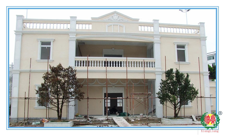 5圓柱形小葫蘆噴涂:現代建筑采用圓柱形小葫蘆做欄桿裝飾,大都要求噴上真石漆,因其小巧玲瓏,極具裝飾性,對它們的噴涂工藝也更為細致。做欄桿裝飾的葫蘆柱,距離太近,有些地方根本無法正面噴涂,所以按一般常規(guī)噴法是無法達到理想效果的。噴涂選用小噴嘴,距離約40cm,快速散噴真石漆,自上而下一面一面來噴,不能正面噴涂的,用抖動噴槍的方法,令其周圍盡量噴上真石漆,然后用毛刷刷平真石漆,沒有噴到的地方也可以用毛刷略微抹上一層,再用噴槍散噴一遍,不能太薄,也不能太厚,蓋住刷痕即可,薄了不能起到很好的保護效果,厚了則遮蓋住了原有的線條美感,也可能出現裂縫等不良表面現象。