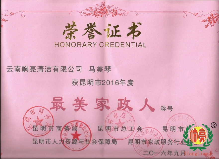 云南響亮清潔有限公司-總經理-馬美琴-被昆明市評選為昆明市-最美家政人-榮譽稱號