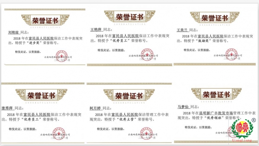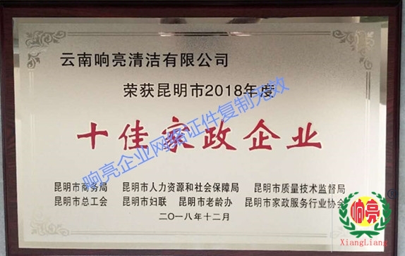 響亮企業通過多年創新與努力,堅持走質量創新發展道路,2018年被昆明市商務局、昆明市人力資源和社會保障局、昆明市質量技術監督局、昆明市總工會、昆明市婦聯、昆明市老齡辦、昆明市家政服務行業協會評為“十佳家政企業”榮譽稱號。